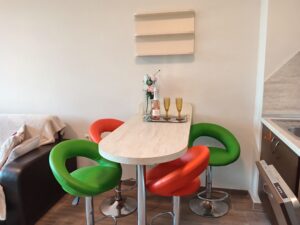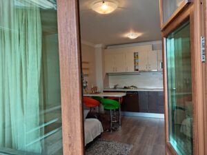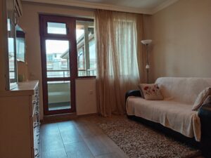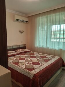 Жилището се продава напълно обзаведено и оборудвано с климатици, което гарантира комфорт през цялата година. Разпределението е практично и създава усещане за уют и функционалност.